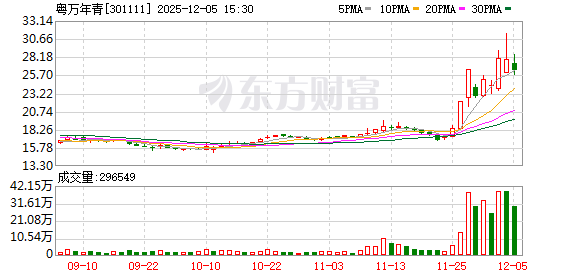 12月5日星耀国际开户,粤万年青(301111)发布公告,股东银康管理通过集中竞价交易累计减持106万股,占公司总股本的0.66345%。